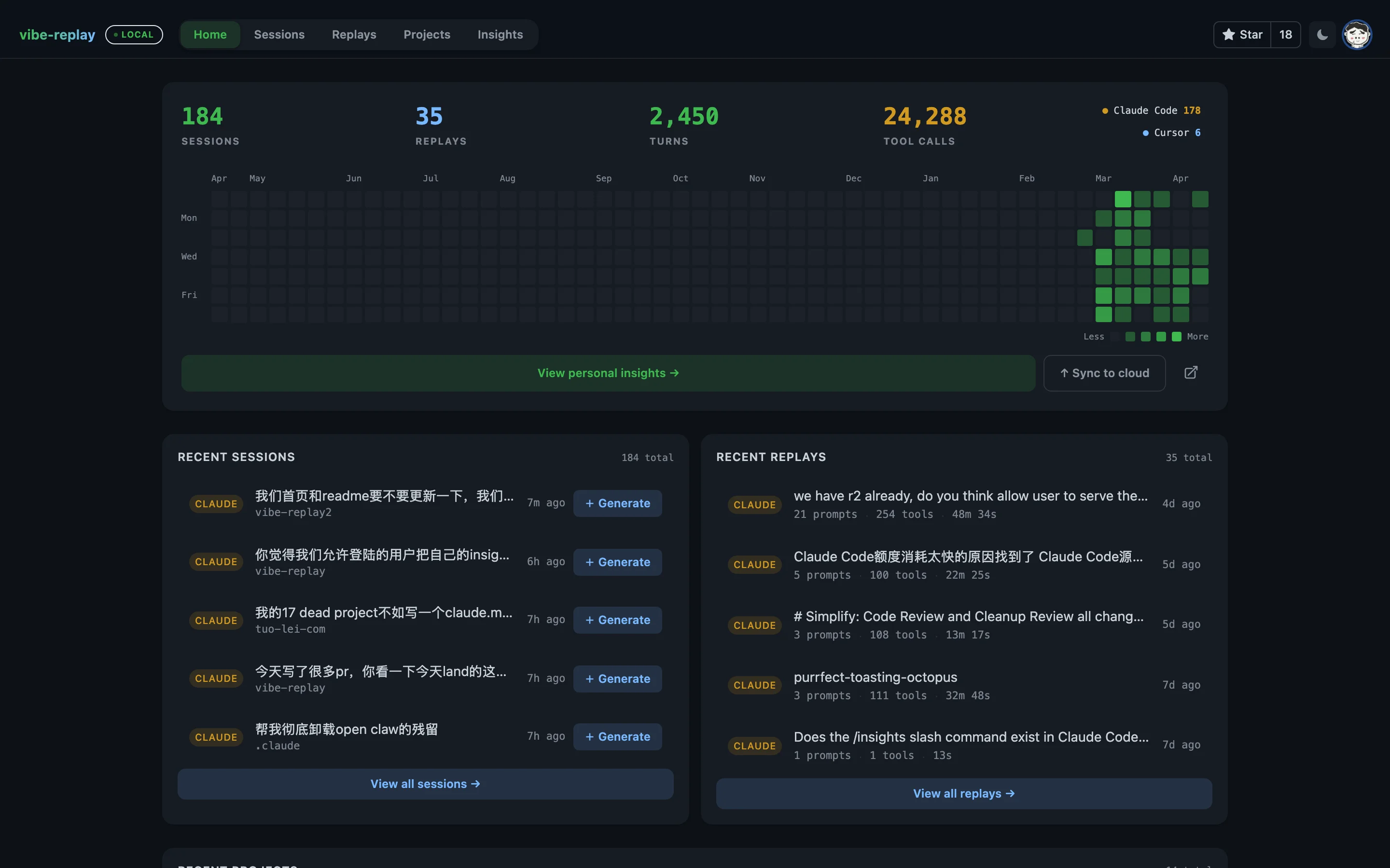 vibe-replay now tracks your AI coding activity across machines and tools. GitHub-style heatmaps, streak tracking, model usage breakdowns — and shareable public profiles.